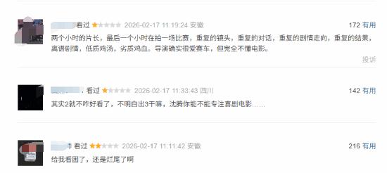 批评声音中,不少人指出影片两个小时的时长里,最后一个小时几乎都在呈现同一场比赛,镜头、对话、剧情走向与结果反复出现,显得冗长。也有观众认为剧情略显离谱,情绪表达流于“鸡汤式”煽情。更有直言不讳的评论称,导演确实热爱赛车,但在电影节奏把控上仍有争议。此外,还有观众表示,第二部已不算出彩,不理解为何推出第三部,并呼吁沈腾更多回归喜剧领域。