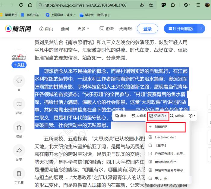 方法一:1、打开QQ浏览器,找到正在浏览的网页,选中想要记笔记的文字,点击【记笔记】→【新建笔记】。