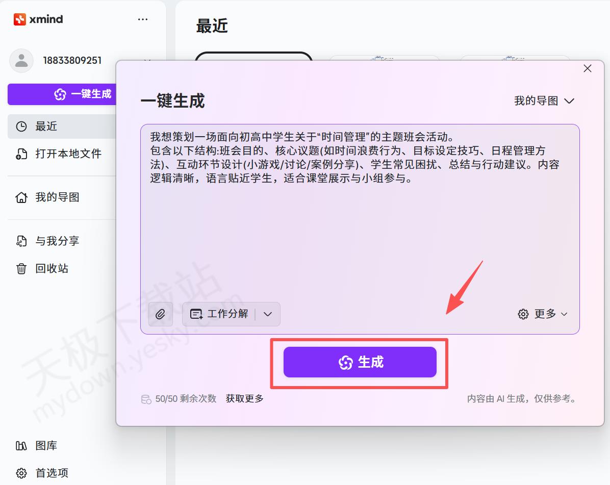 2.在上方输入思维导图的应用场景主题,补充思维导图应该具备的内容,然后点击【一键生成】。