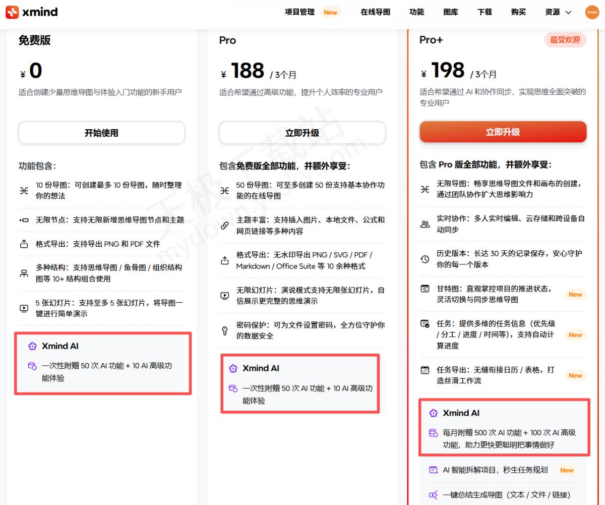 经调查,XMind一键生成思维导图是需要付费使用的,不过每位注册用户都能获得50次免费的AI功能体验机会,免费次数用完后,需升级为Pro 版本才能继续使用,Pro 版本用户每月可享受500次AI功能体验次数,满足高频使用需求。