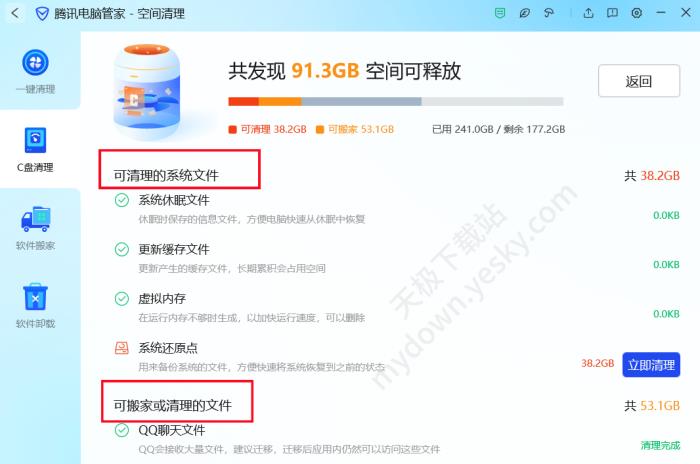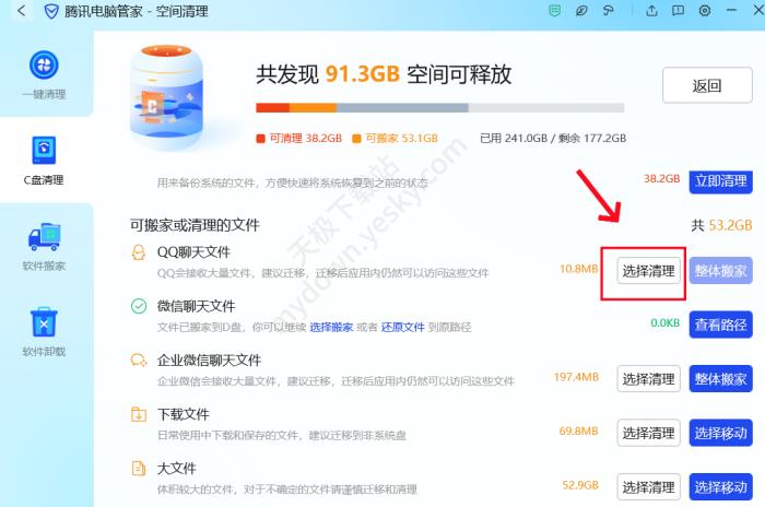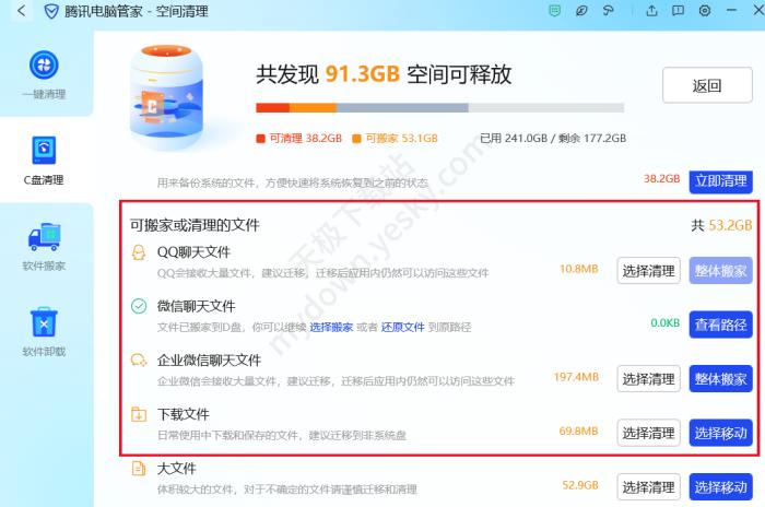 经过实际测试,腾讯电脑管家的C盘清理功能非常出色,扫描后会给出一些清理建议,能释放不少内存空间,比如清理聊天文件、系统缓存,还有迁移下载的文件等等。推荐大家试试,感受一下它的清理效果。