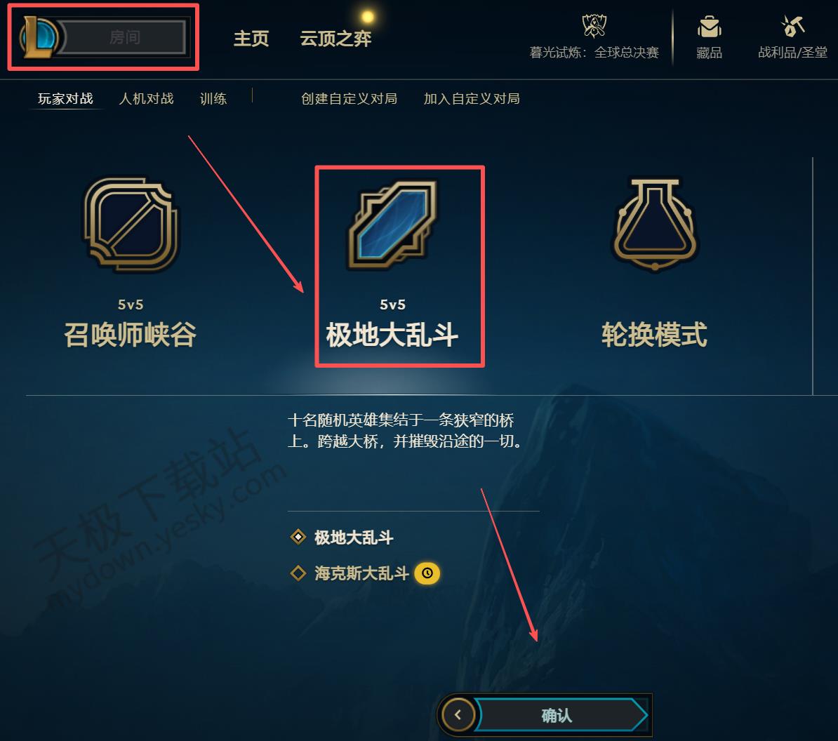 1.打开最新版本的英雄联盟客户端,点击上方【play】,选择极地大乱斗模式。