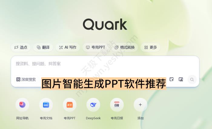 我要推荐的图片智能生成PPT软件是夸克,在2025年9月底,【夸克PPT全新升级】上线,核心亮点在于:支持上传图片生成PPT,效果非常不错。天极软件测试员推荐给各位办公达人,以下是图片智能生成PPT攻略,希望对你有帮助。
