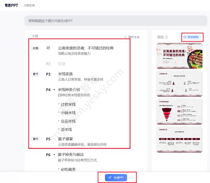 3、网页左侧可以查看内容大纲,右侧会有生成的PPT预览,可以点击文字直接对内容进行修改和编辑,也可以更换模板,修改好后点击【生成PPT】。