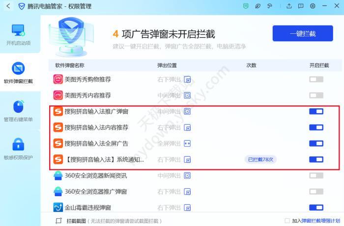 2、在软件弹窗拦截界面,找到搜狗拼音输入法相关的弹窗名称,比如:搜狗拼音输入法推广弹窗、搜狗拼音输入法内容推荐、搜狗拼音输入法全屏广告等。点击对应的右边按钮开启拦截即可。