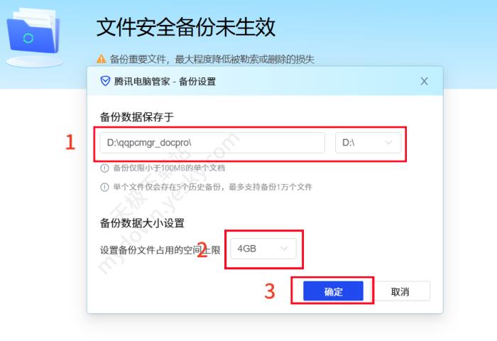 3、点击【立即开启】后,设置备份数据保存的位置以及占用的空间上限大小,最后点击确定。