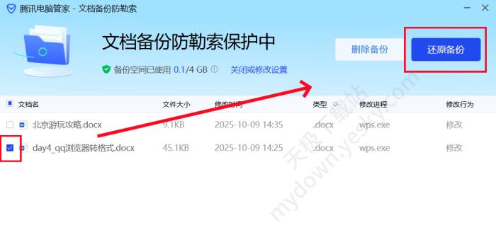 答:经实际测试验证,文件被修改过后腾讯电脑管家将会自动备份修改前的文件,我们只需在【文档备份防勒索】界面找到想要还原的文件,点击还原备份,选择还原路径后即可还原成功。