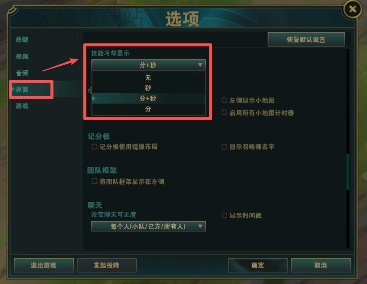 2.然后我们点击【ESC】键位,点击【界面】,在右侧找到【技能冷却显示】,然后进行更换,目前最好用的是“分 秒”。