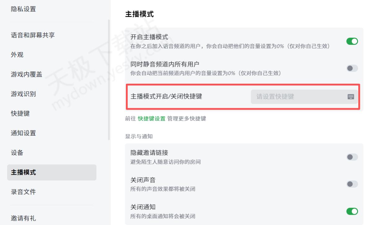 2.进入设置页面后,在左侧菜单栏中找到【主播模式】选项,点击进入,然后勾选“开启主播模式”的开关。