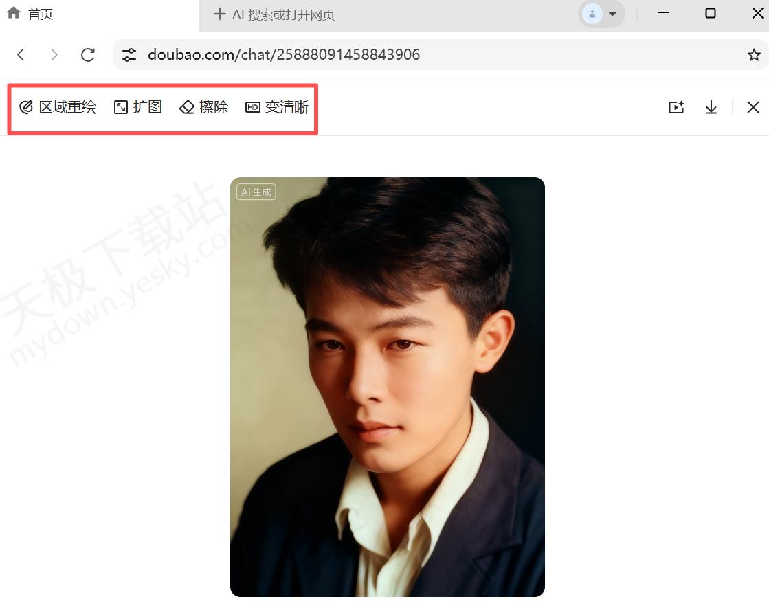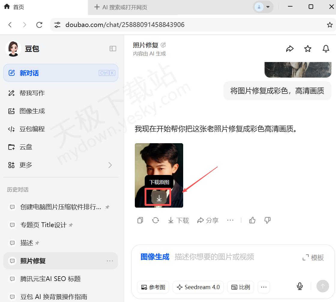 3.稍等片刻,豆包会生成修复好的照片,点击【下载】即可保存。