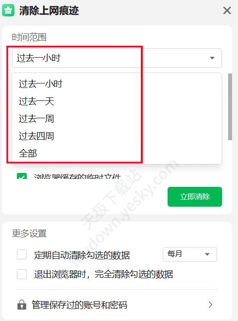 3、会弹出清除上网痕迹的弹窗,可以选择清除痕迹的时间范围,可供选择的范围有过去一小时、过去一天、过去一周等。