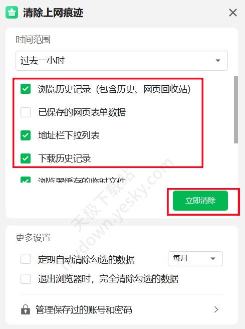 答:360安全浏览器是支持用户定期清除上网痕迹的,只需在清除上网痕迹界面【更多设置】中勾选【定期自动清除勾选的数据】并选择清除的频率如:每天、每周、每月即可。