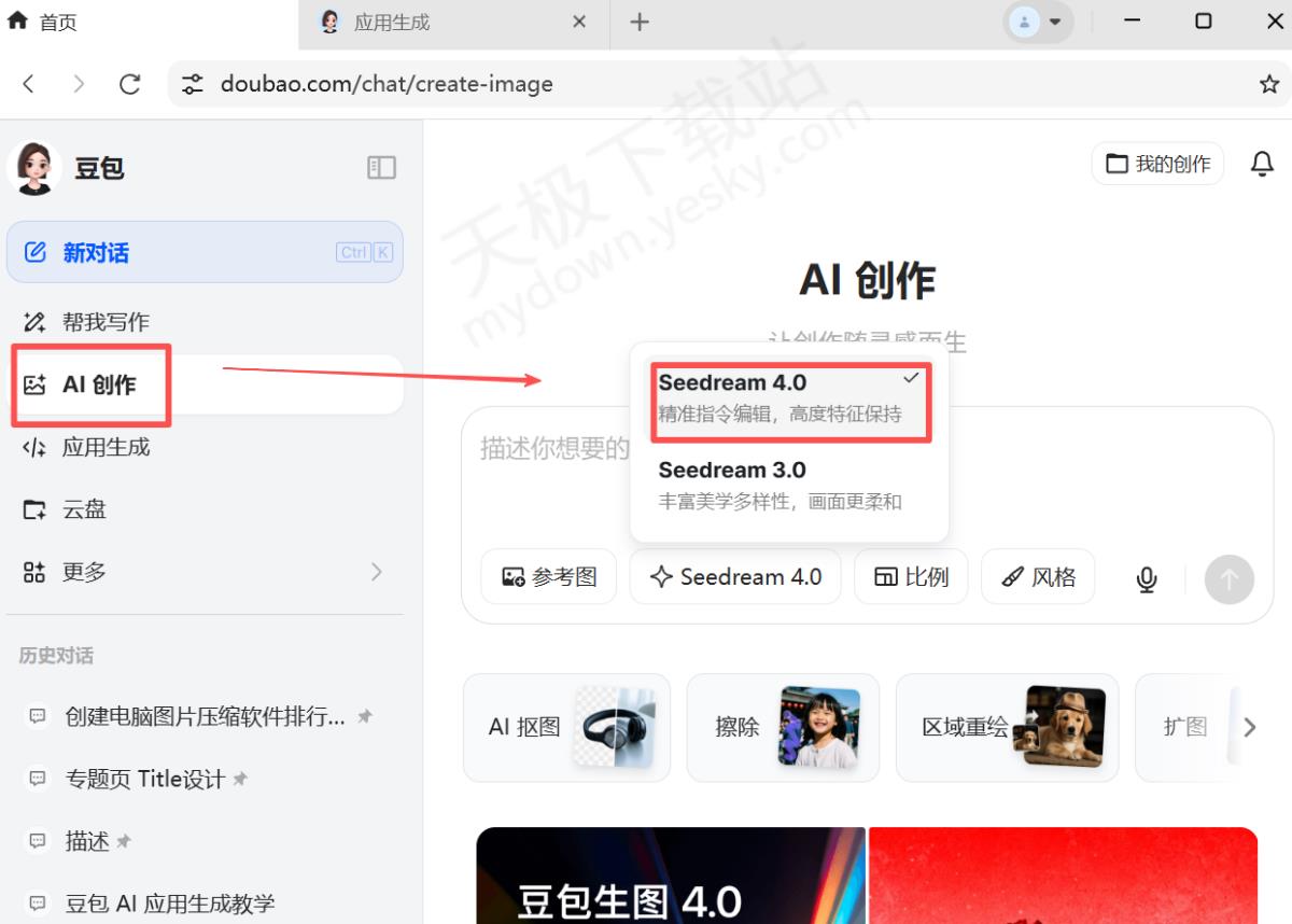 1.打开最新版本的豆包,在首页点击左侧【AI创作】,右侧将模型切换成【seedream4.0】。