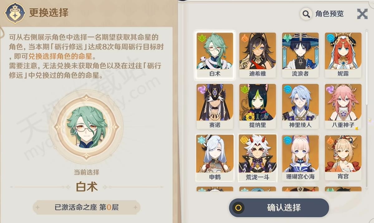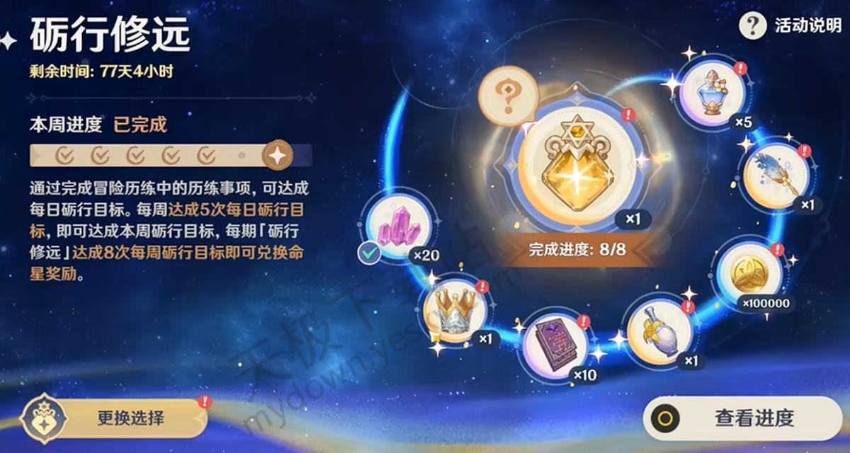 4.最终奖励:累计达成8次每周砺行目标即可兑换命星奖励,可自行选择一个限定5星角色的命星。