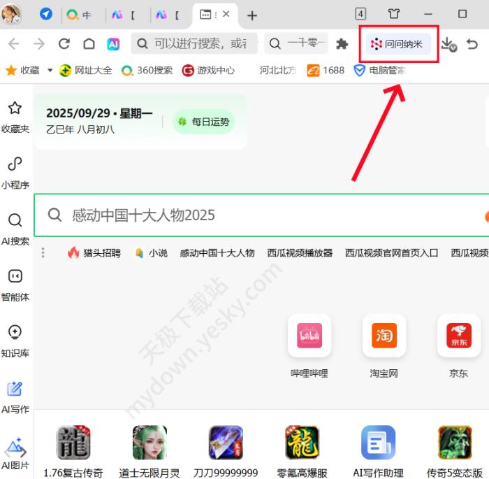 1、打开360安全浏览器,进入首页后点击右上角【问问纳米】。