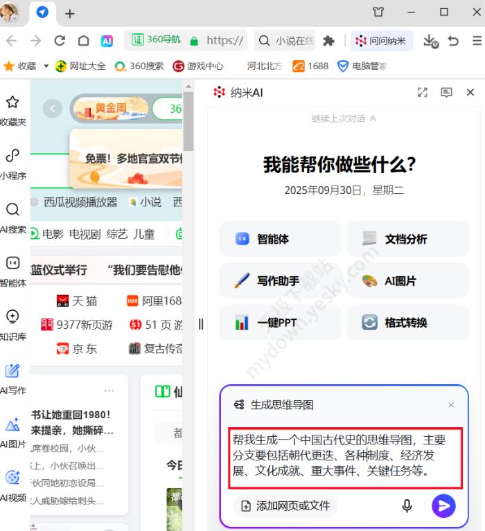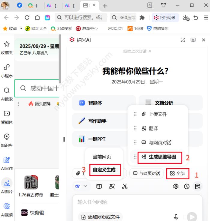 360安全浏览器中,问问纳米一键生成思维导图的方法教程
