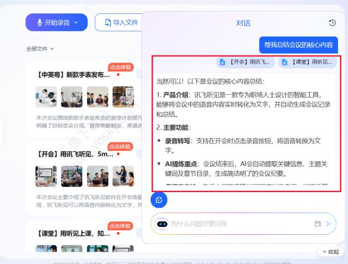 3、在对话框输入需求比如:“帮我总结会议核心内容。”并上传相应的会议文件。