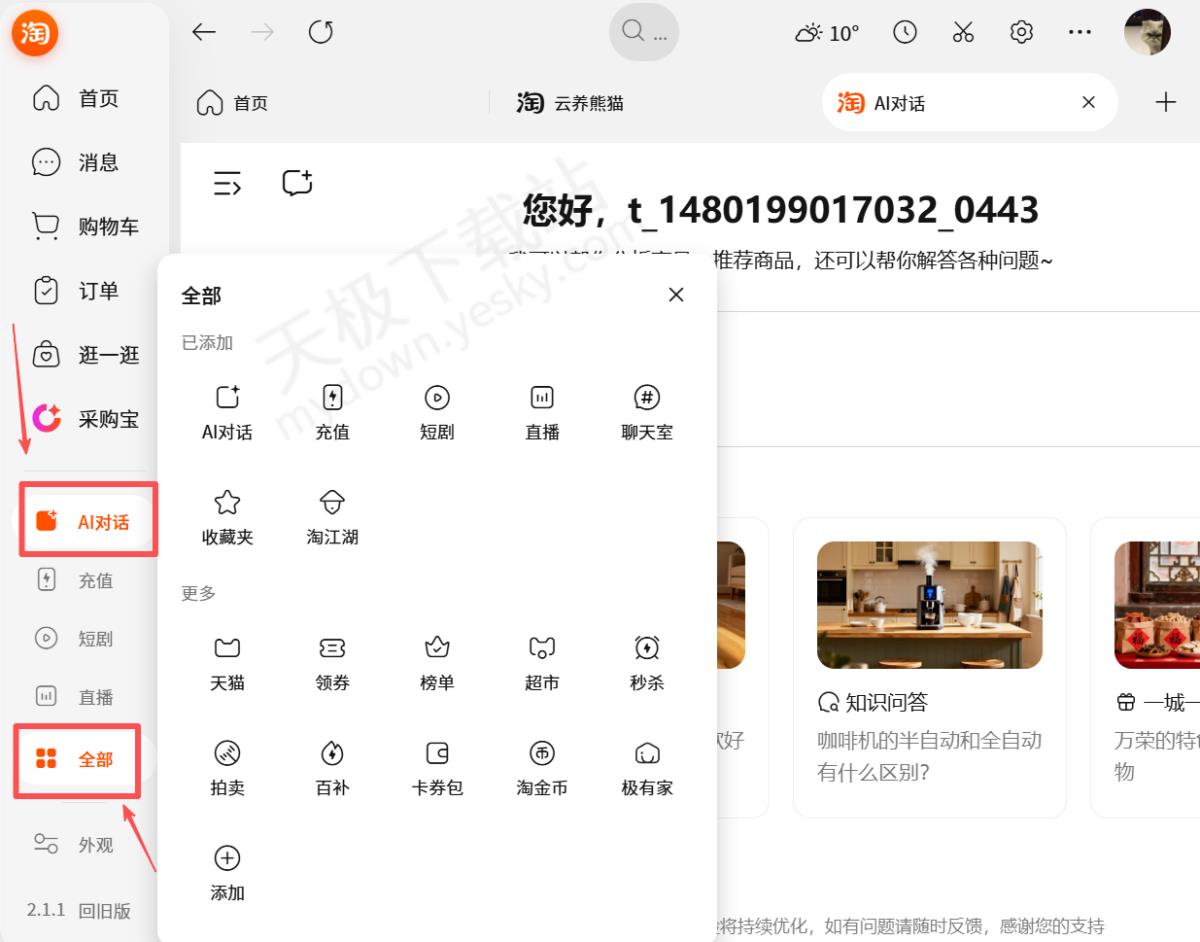 1.打开最新版本的淘宝桌面版,点击左侧【AI对话】选项。如果没有找到的话,可以点击下方【全部】选项,在展开栏可看到。