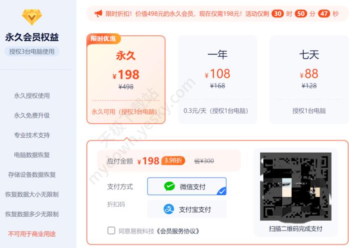 答:经过天极软件测试员实际测试验证,易我数据恢复是需要开通VIP才可以对数据进行恢复的,VIP费用详情:永久会员是498元(可以授权3台电脑),一年会员是168元,7天会员是128元。