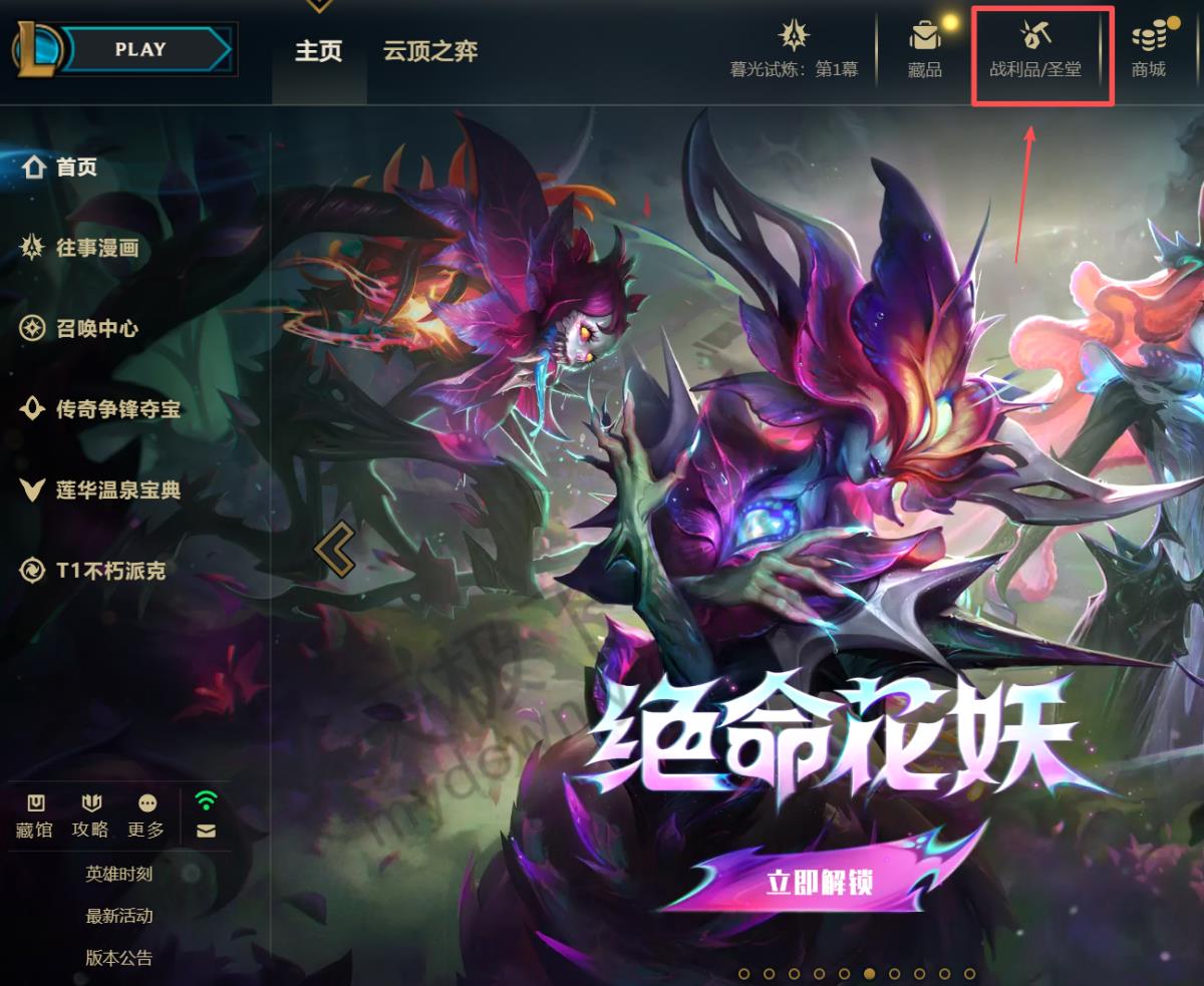 1.打开英雄联盟客户端,点击右上角【战利品】。