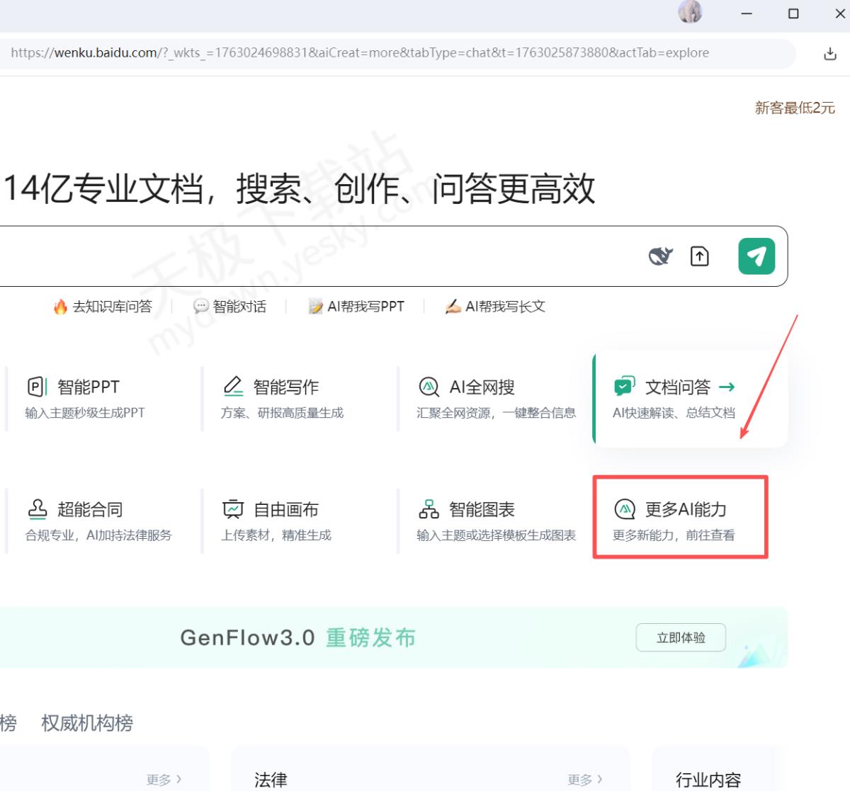 1.下载并打开最新版本的百度文库客户端,点击首页右下角【更多AI能力】。