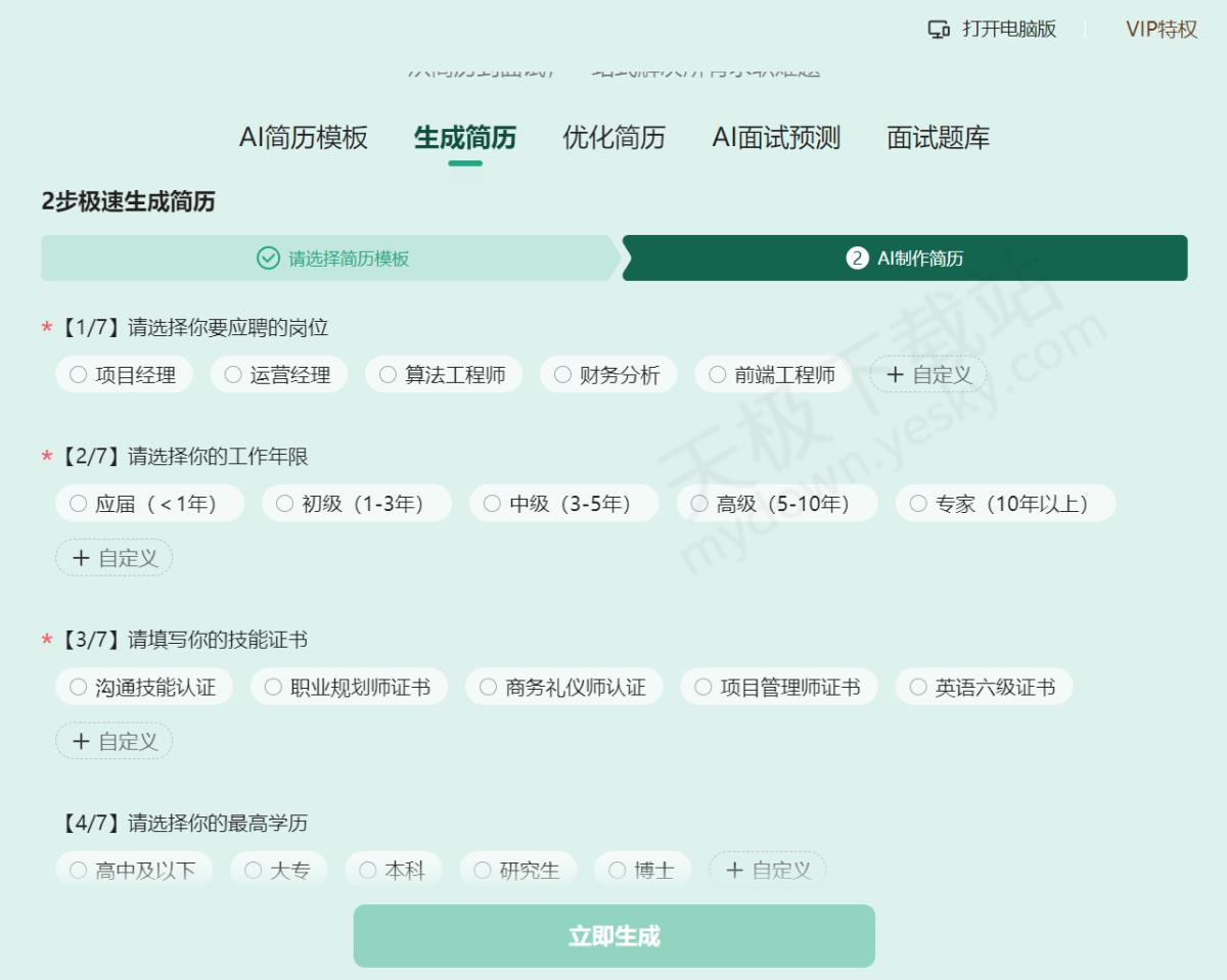 4.根据提示输入应聘岗位、工龄、技能证书、最高学历等信息,最后点击【立即生成】。