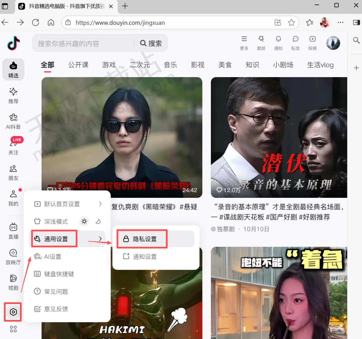 1.在抖音官网首页点击左侧【设置】,选择【通用设置】-【隐私设置】。