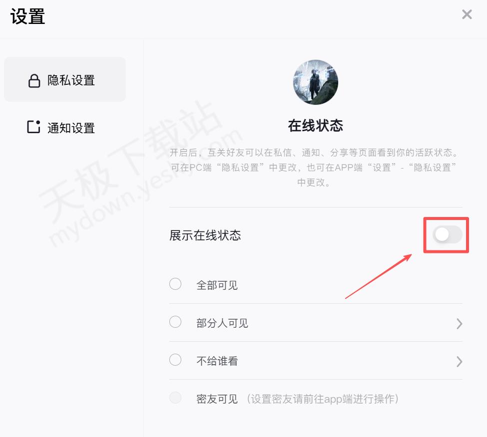 2.将【展示在线状态】选项关闭。