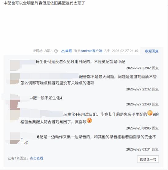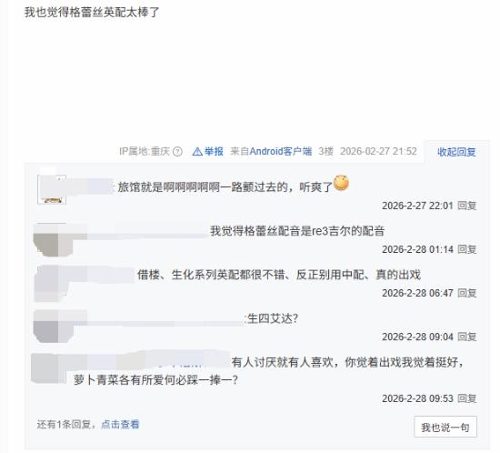 《生化危机9:安魂曲》一上线,玩家们就被这个让人欲罢不能的游戏世界吸引住了,特别是配音方面。贴吧里不少玩家纷纷表示,声优的表现让游戏体验更上一层楼。尤其是格蕾丝的英文配音,大家都觉得听得相当过瘾。
