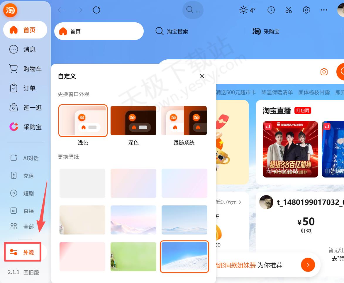 1.打开最新版本的淘宝桌面版,点击左下角【外观】,在右侧【更换壁纸】处可随意挑选。