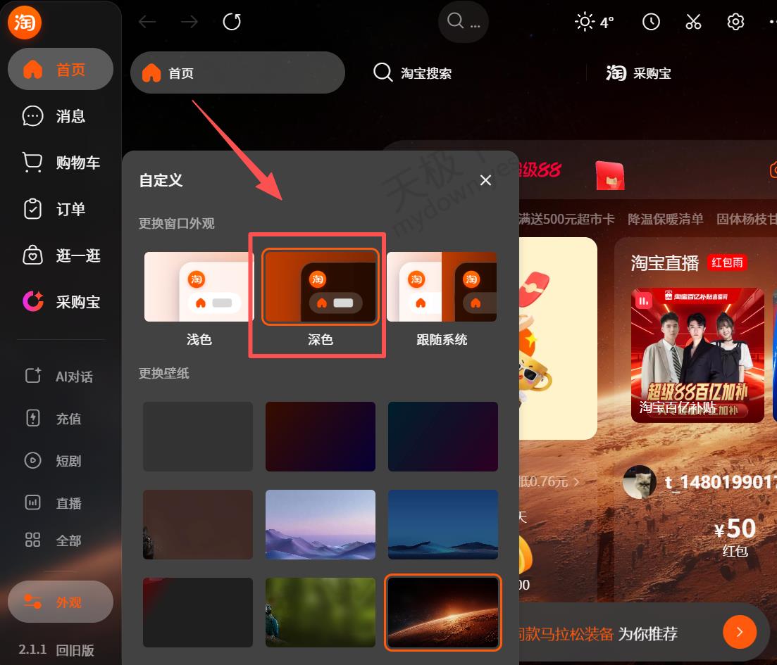 淘宝桌面版能自定义界面壁纸吗