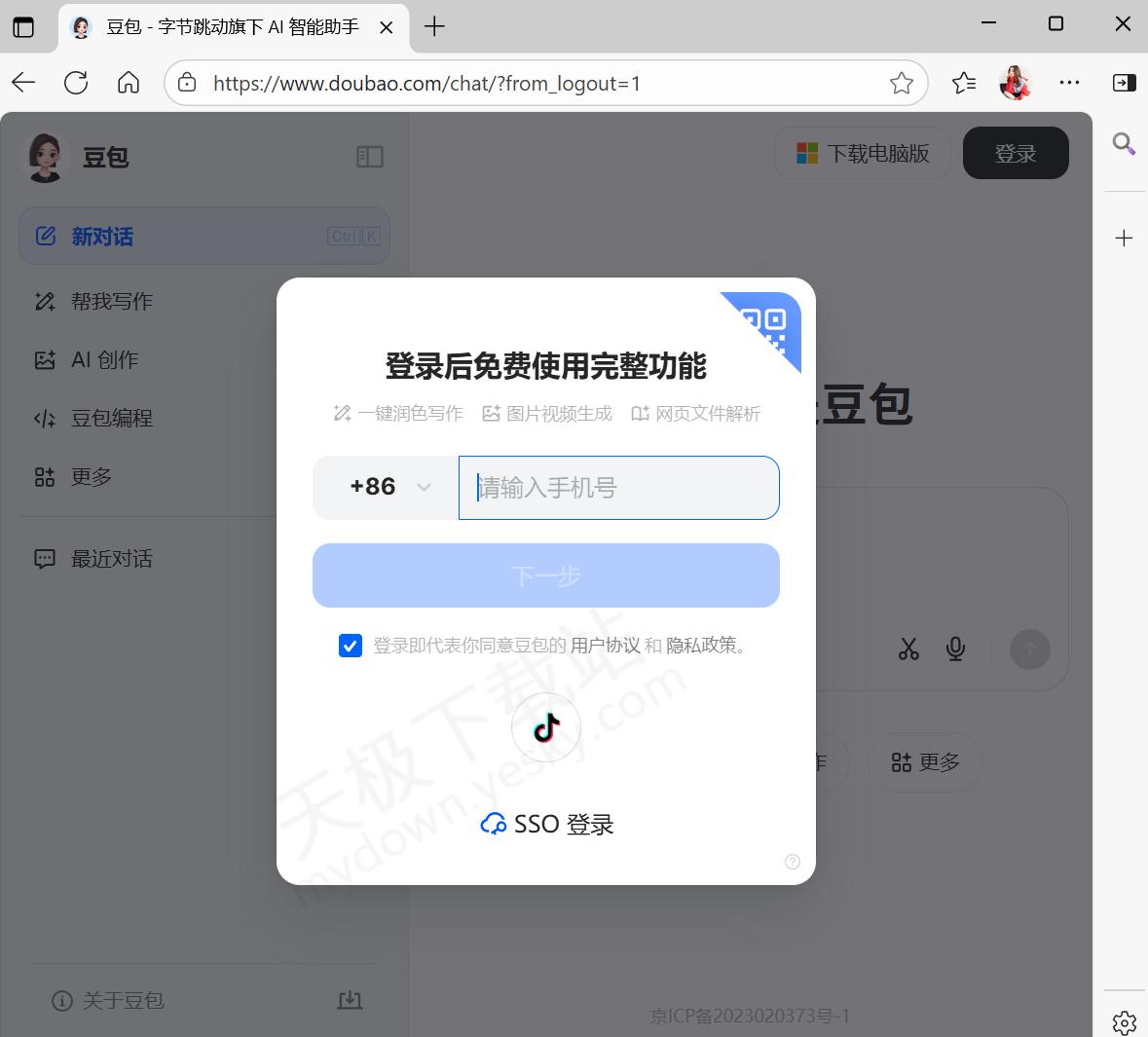 2.可以通过手机号发送验证码的方式登录,也可以通过抖音客户端或豆包手机端扫码快捷登录。