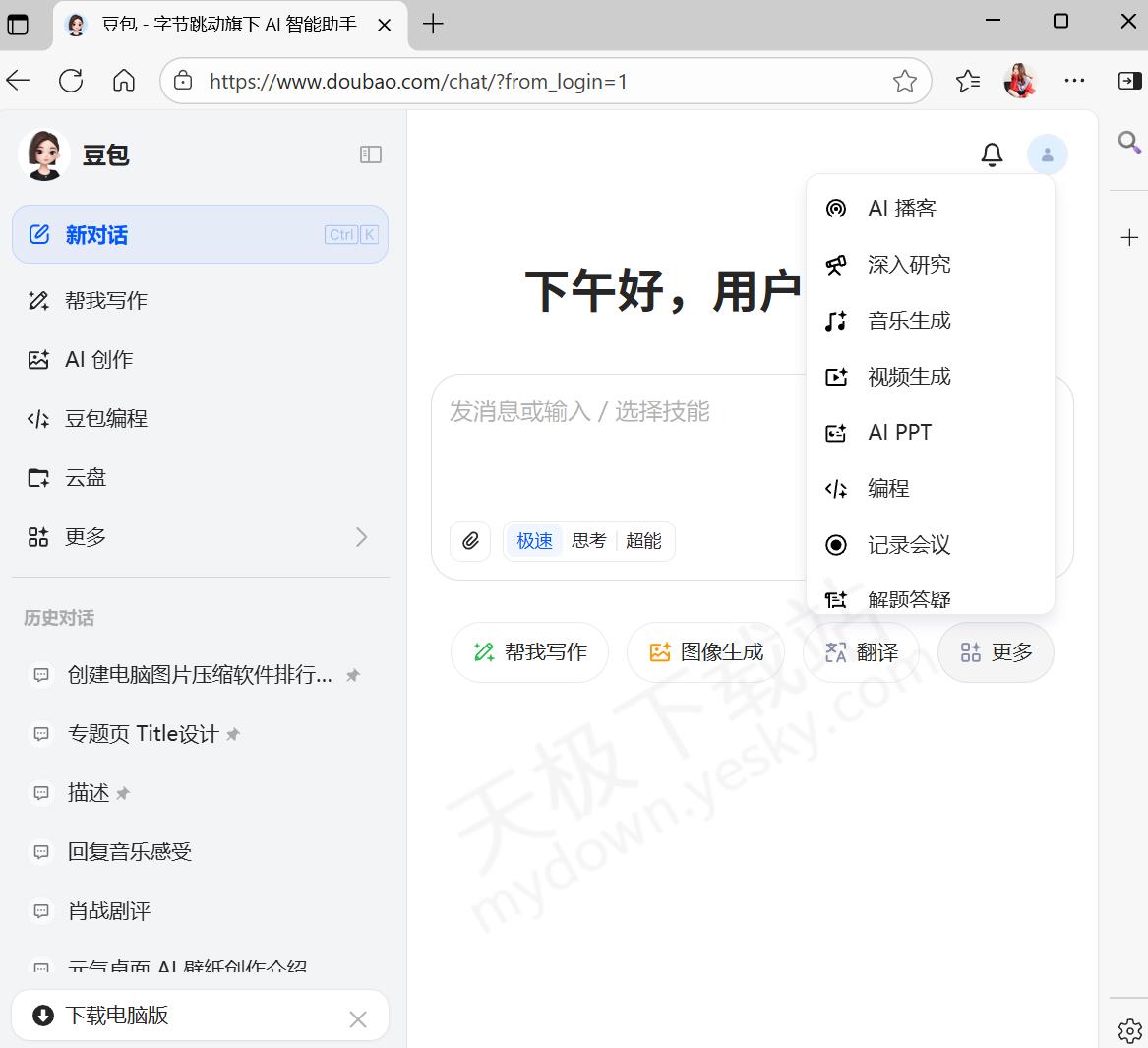 根据调查结果,豆包网页版与桌面版的AI功能完全相同,像AI写作、AI图像生成、AI编程、AI云盘等功能应有尽有,桌面版拥有的所有功能,网页端都已全部包含。