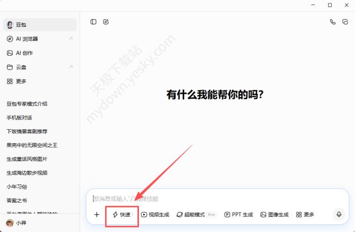 1、打开豆包电脑版,在页面下方对话框左下角找到【快速】。