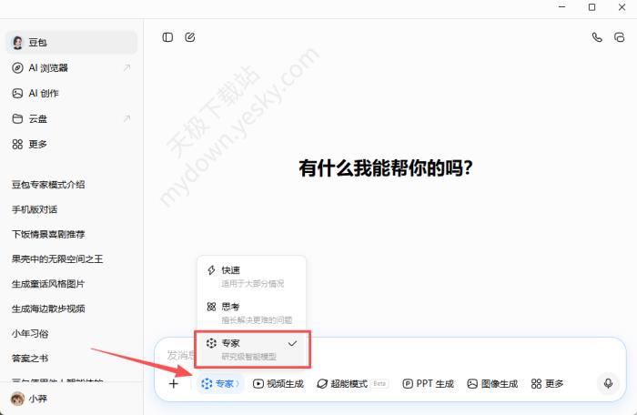 2、点击【快速】,即可选择模式,选择【专家】即可成功切换到豆包专家模式。