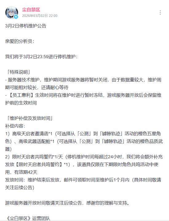 尘白禁区今晚停机维护,服务器具体开放时间待定