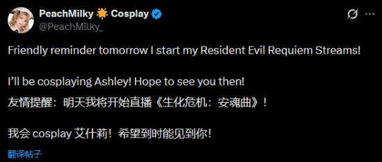 近日,《生化危机2:重制版》碍事梨的体模PeachMilky发布推文称,将开始直播《生化危机9:安魂曲》,届时她将cos碍事梨,操控里昂和格蕾丝。