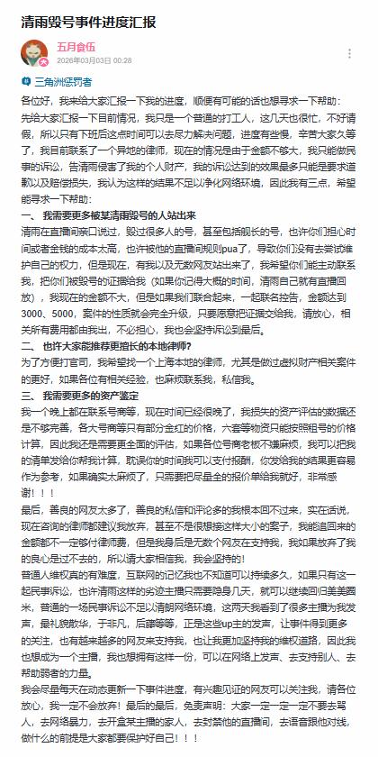 当事人玩家“五月食伍”在个人社交平台公开了维权进度汇报。尽管作为一名普通打工人面临取证难、诉讼成本高等重重阻碍,但他明确表示:绝不放弃,将维权到底!