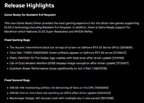 据介绍,上周,在《生化危机9:安魂曲》发售前,英伟达曾发布595.59 WHQL驱动以支持该作,但在发布数小时后便撤下了下载,并建议玩家回滚到此前版本。正如英伟达当时的回应以及今日驱动更新说明所述,此次撤回的原因在于一个严重Bug:该问题会导致风扇监控异常,甚至出现“驱动更新后GPU上一个或多个风扇不转”的情况。