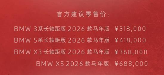 宝马中国宣布推出2026款马年版,包括3系长轴距、5系长轴距、X3长轴距和X5四款车型,融入马年专属设计,售价分别为31.8万、41.8万、36.8万和68.8万。