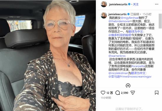 “我的教女玛吉·吉伦哈尔制作了《暗黑新娘!》——一部大胆、狂放、朋克、女权主义歌剧般的电影,她送了我一些内衣,这是与维多利亚的秘密的合作项目之一,我今天穿上它,既是为了支持我的‘赚钱工具’,也是为了支持她的电影,”柯蒂斯在配文中写道。这位好莱坞传奇人物继续写道,她“想不出如何向她表达我的支持,所以这是在纽约市转悠的豪华轿车里我能想到的最好方式。我他妈的为她感到骄傲。”