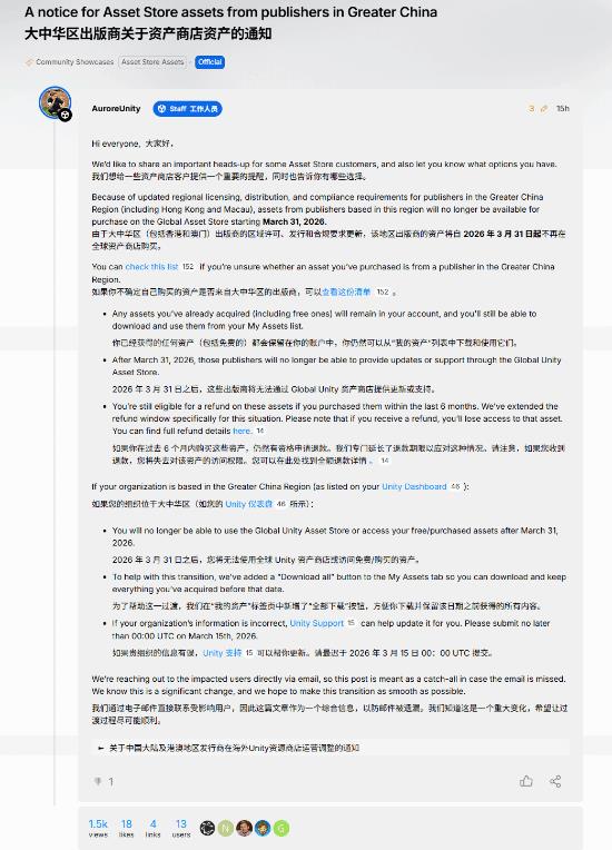 政策调整的核心内容 - 服务终止范围:自2026年3月31日起,所有运营地点位于中国大陆及港澳地区的组织将无法访问海外Unity资源商店,包括免费资源、已购资源及后续更新服务。Unity官方记录的组织运营地点信息将作为判定依据,用户需在2026年3月15日8:00(北京时间)前提交异议申诉。