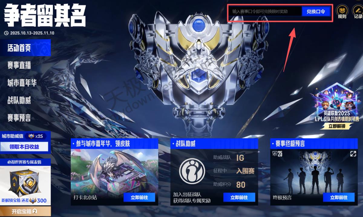 在2025英雄联盟全球总决赛的部分场次直播中,官方会给出口令码,玩家获取口令码在客户端【争者留其名】活动右上角输入后,有概率获得英雄皮肤、蓝色/橙色精粹奖励以及2025英雄联盟全球总决赛冠亚军决赛门票。