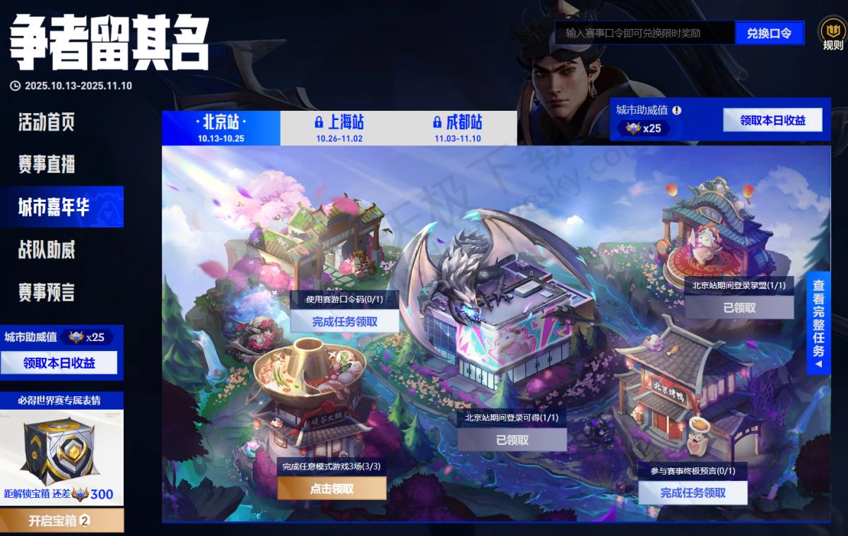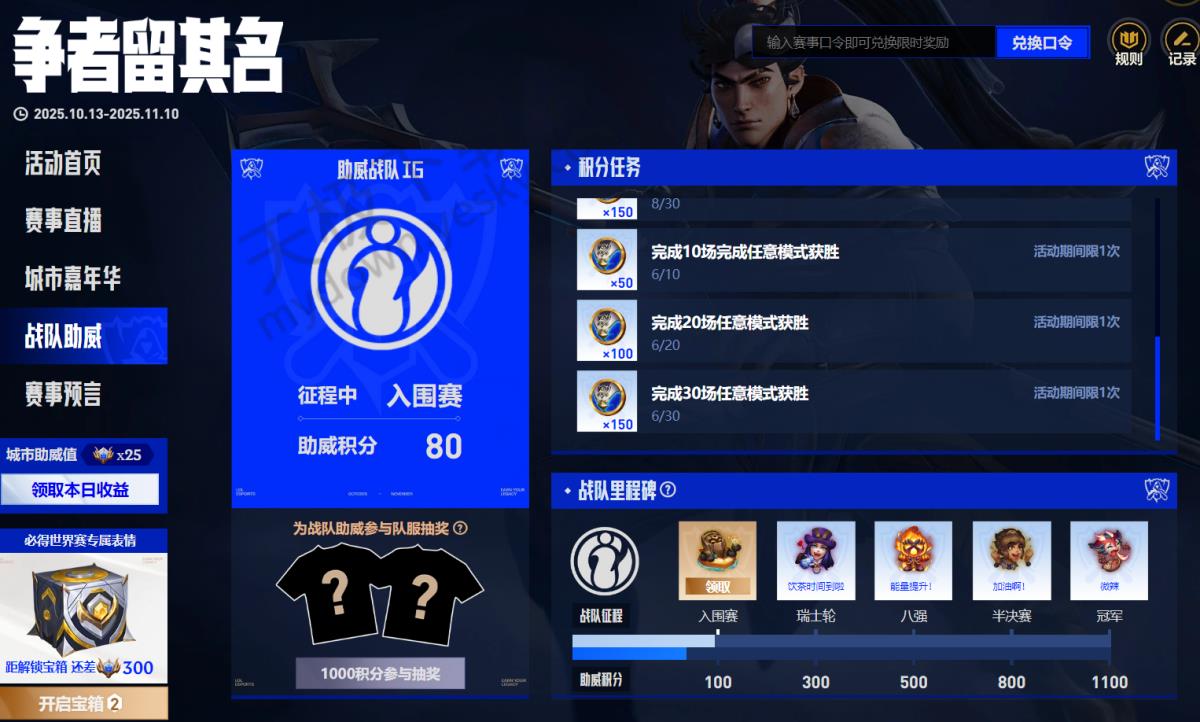 2025英雄联盟全球总决赛观赛活动“争者留其名”已经在10月14日上线啦。这次活动从2025年10月13日持续到11月10日,大家可以通过看比赛直播、完成城市电量任务、给喜欢的职业战队加油来赢取丰厚的奖励,包括大量的蓝色/橙色精粹、限时皮肤以及S15世界赛的限定表情。