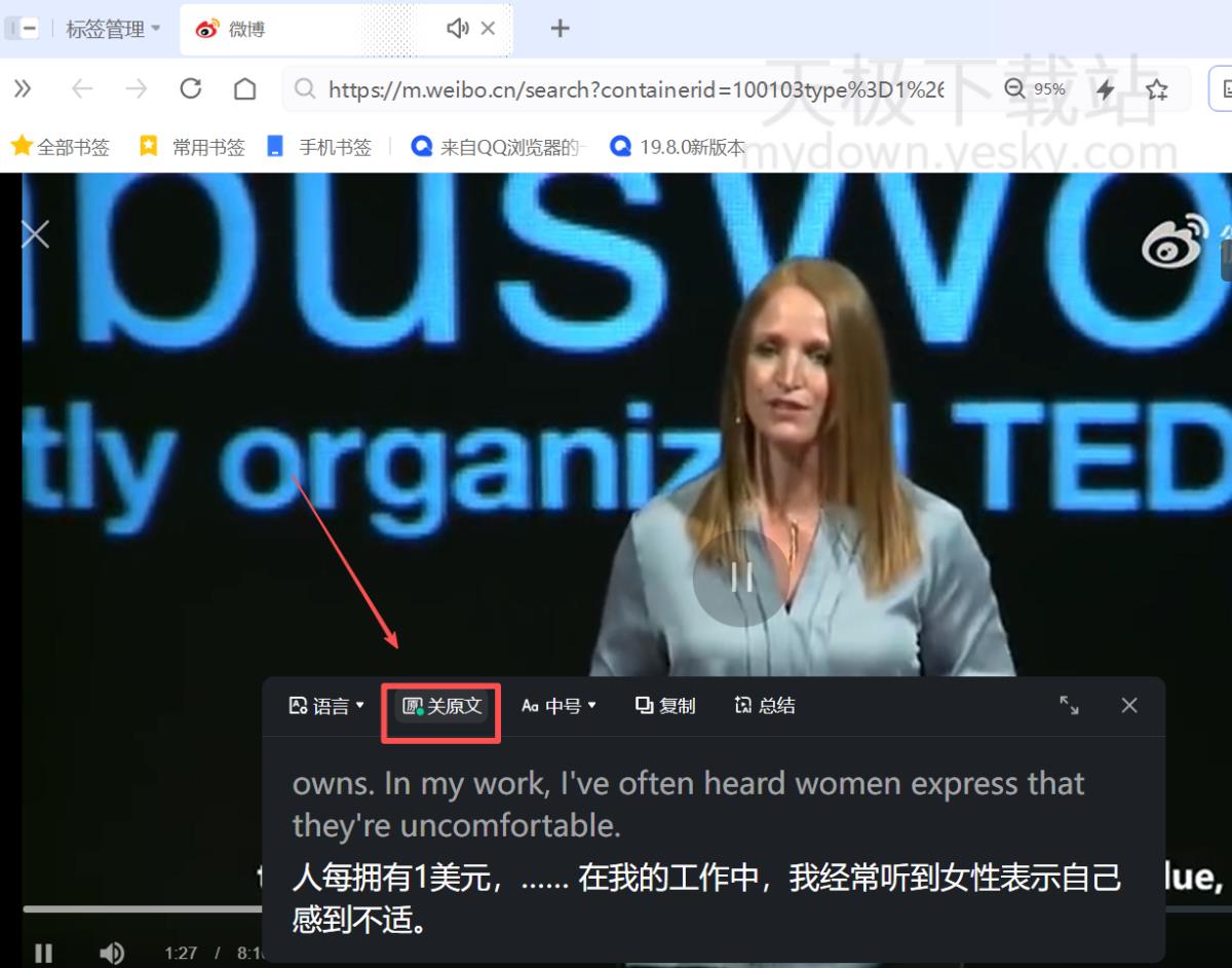 4.在上方有“开原文”的选项,打开后上方会显示视频原文,下方是翻译。