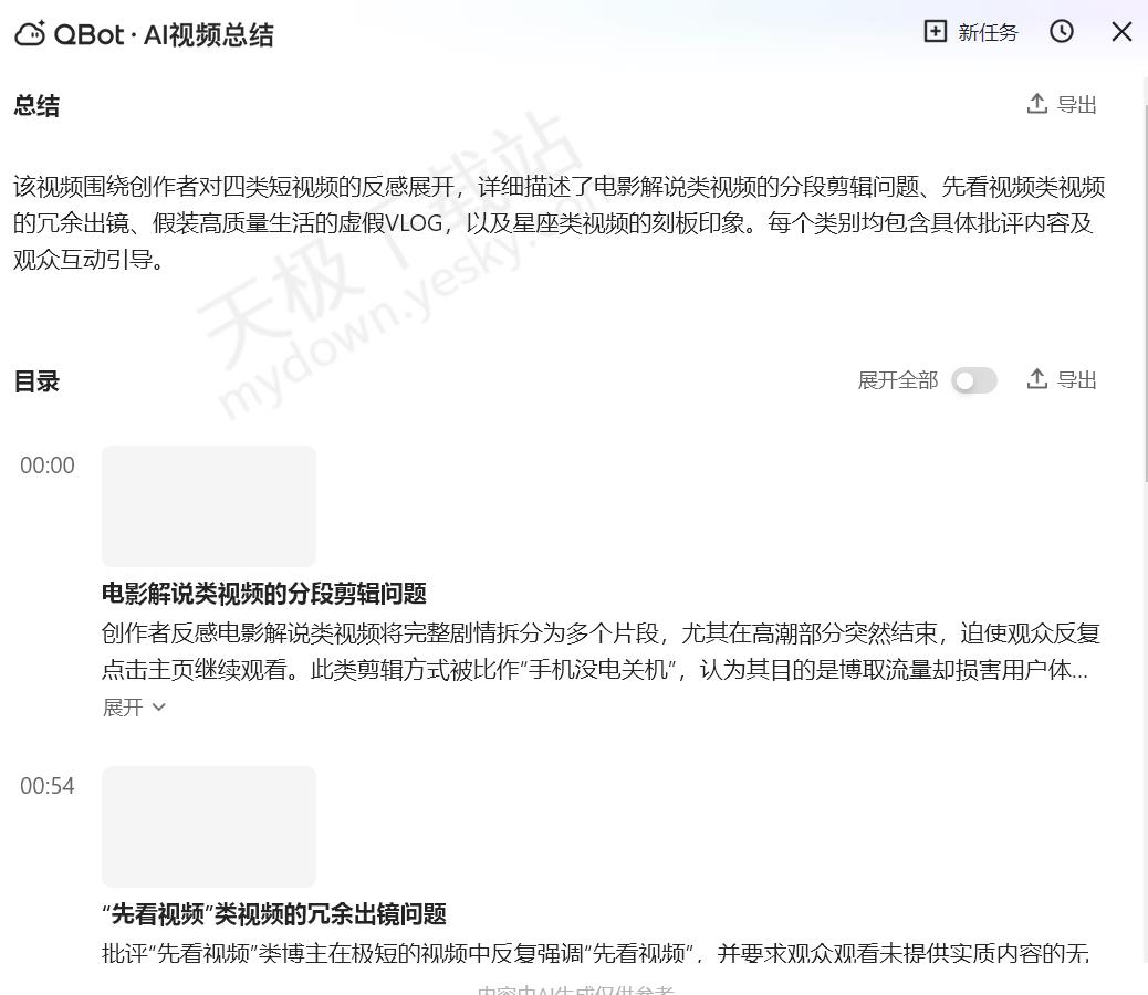 经实测,QQ浏览器的AI视频总结工具体验还不错。对于知识类视频(如课程讲解、科普干货),能准确抓取核心知识点和逻辑框架,但对于一些音乐类、剧情类的视频,识别准确度较差。比较适合学生党用来总结网课重点,节省整理笔记的时间、职场人快速提炼行业会议录屏、产品介绍视频的核心信息。