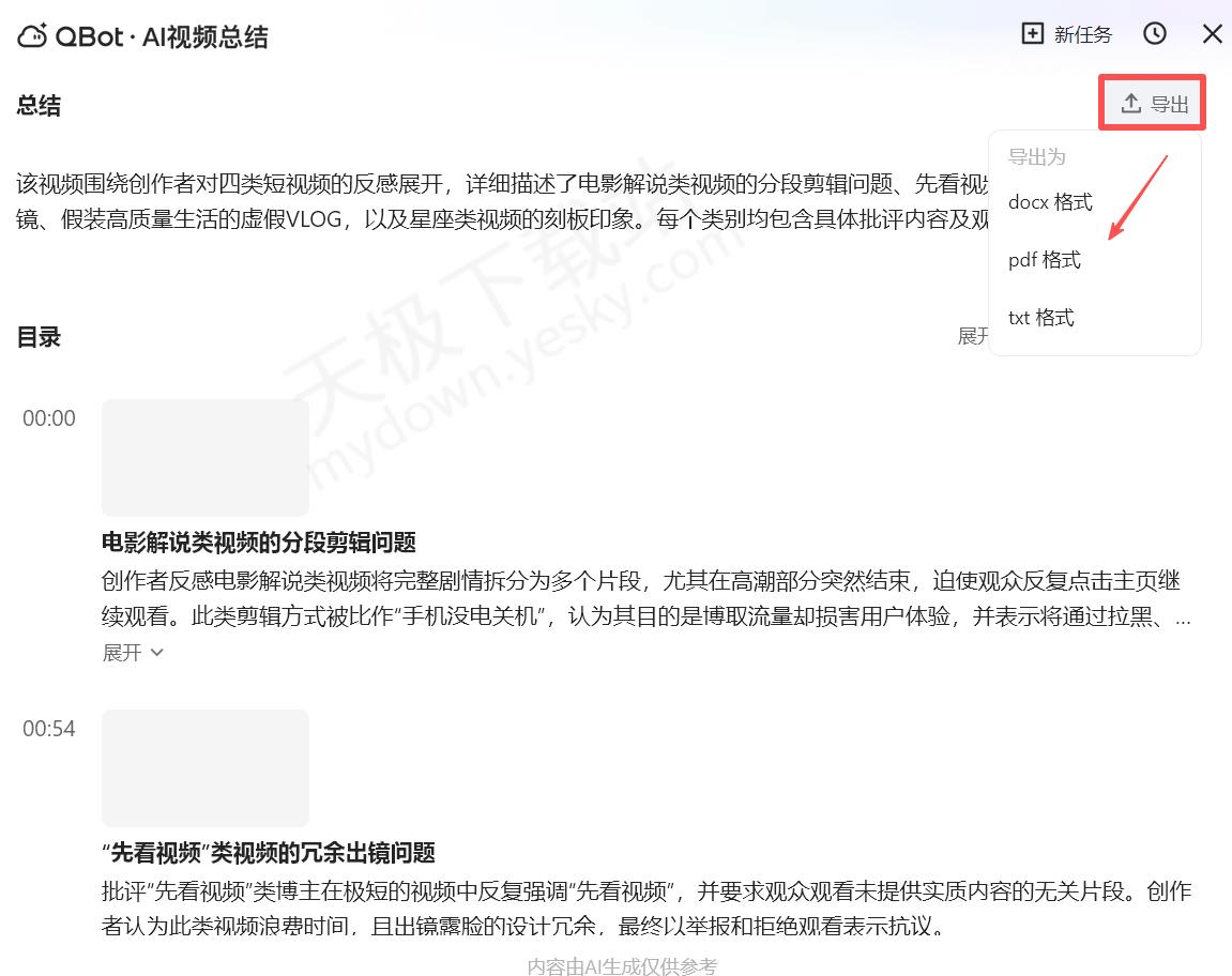 4.点击Qbot窗口右上角【导出】,可将视频总结文案保存下来。