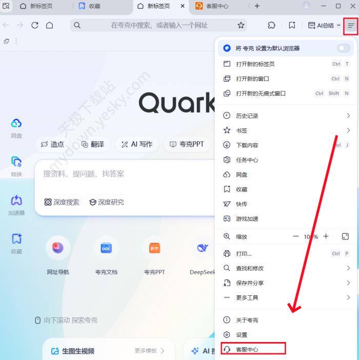 1、打开夸克浏览器主页,点击右上角【☰】→【客服中心】。