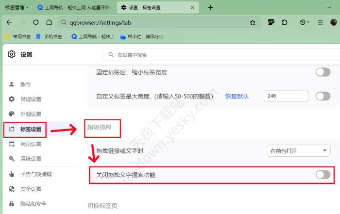 2、进入到【设置】界面,点击【标签设置】→【超级拖拽】,找到【关闭拖拽文字搜索功能】的按钮,使其为关闭状态