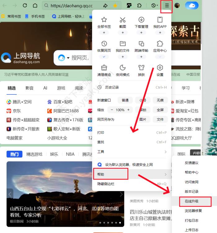 升级到最新版QQ浏览器,点击QQ浏览器首页右上角【☰】→【帮助】→【在线升级】。